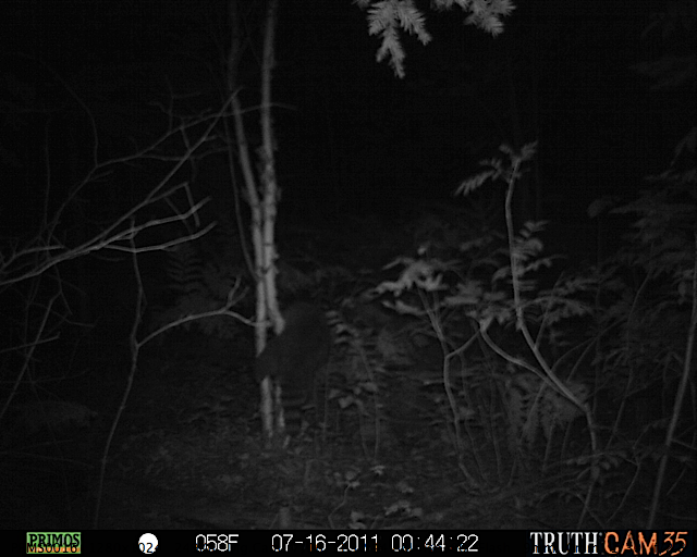 I don't know what this is, and it apparently doesn't stay long because the wildlife camera doesn't take any more photographs on this night, as it would if the animal had remained in view. I suppose it's possible that what looks to be a longer tail could simply be a part of a bear's body that is partially obstructed by the vegetation. But it looks like something a little smaller than a bear, and like something that slinks along the ground, such as a weasel. I don't know what it is.